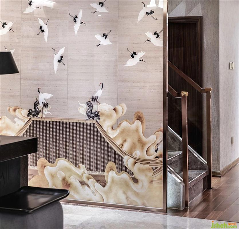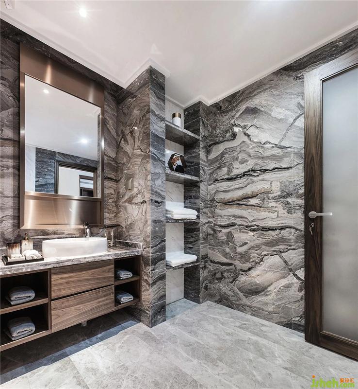 The bathroom space is very large, the wall is covered with black and white gray variegated tiles, the shower room is set with dry and wet partitions, and the dim light is used to reflect the low-key beauty of the new Chinese style.