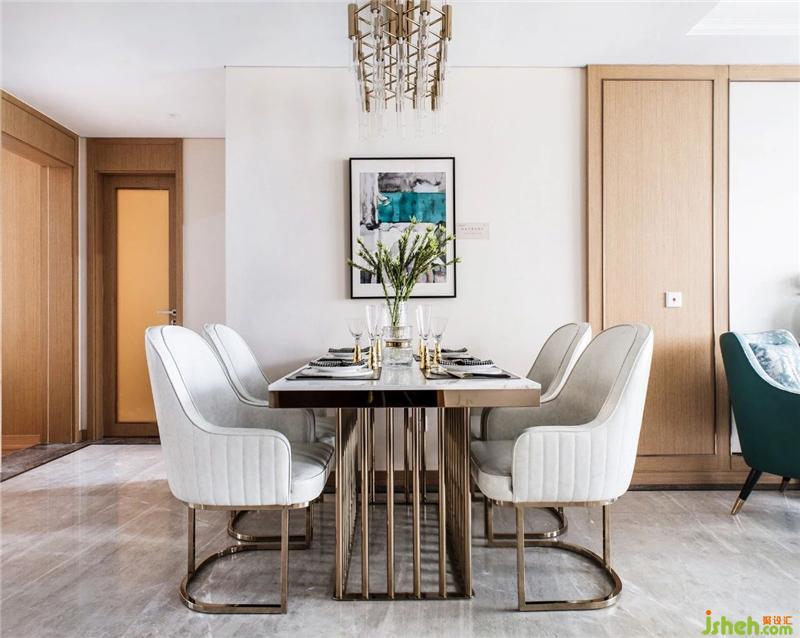 空間以湖水綠為點(diǎn)綴色,布藝上使用絲絨、皮質(zhì)面料,加上些許銅質(zhì)金屬,整個(gè)空間溫馨且華貴。