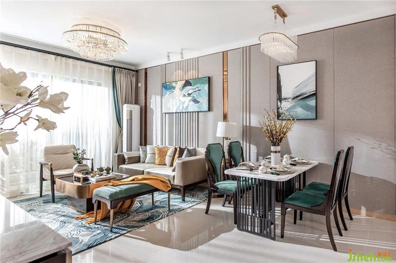 本案主調(diào)中式山水意境點(diǎn)綴皎月與嶺南建筑元素。使整體空間富有時(shí)尚感,沉穩(wěn)、大氣且層次分明。室內(nèi)陳設(shè)色調(diào)延續(xù)木本色的基礎(chǔ)色調(diào),融入苔綠色,與室外美好景色隔空對(duì)望,宛如翡玉,悅見(jiàn)悠然雅境 。樣板房設(shè)計(jì)