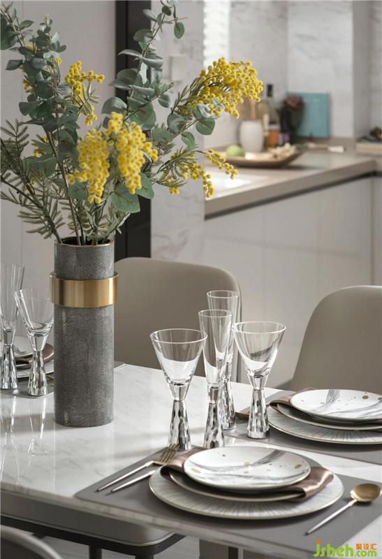 空間的綠,一直延伸到餐廳。簡單的大理石餐桌,捫皮木質金屬椅,時尚質樸的吊燈設計,點綴幾抹黃與綠,十分和諧,彰顯了主人平和的生活態(tài)度以及生活品味。