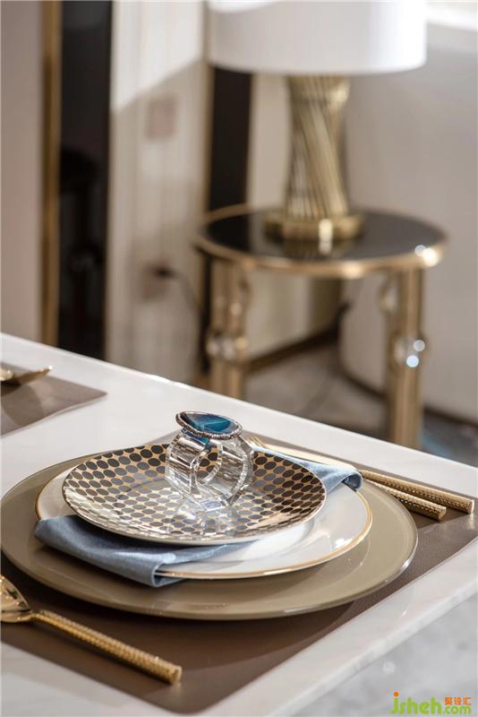 餐桌花藝以及餐具點(diǎn)綴寶石藍(lán),與主題相呼應(yīng)。以豐饒的創(chuàng)意表達(dá)生活內(nèi)涵和當(dāng)代氣質(zhì),將空間具化為實(shí)用與美學(xué)交織相融的生命體,賦予空間輕奢、雅致而舒適的生活氛圍。