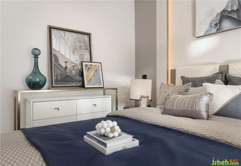 次臥空間繼續(xù)延伸藍(lán)色元素,與現(xiàn)代裝飾畫(huà)相得益彰、交相輝映外,白色的幾何線條、輕體量的功能性軟裝搭配,讓整體空間不失層次感。