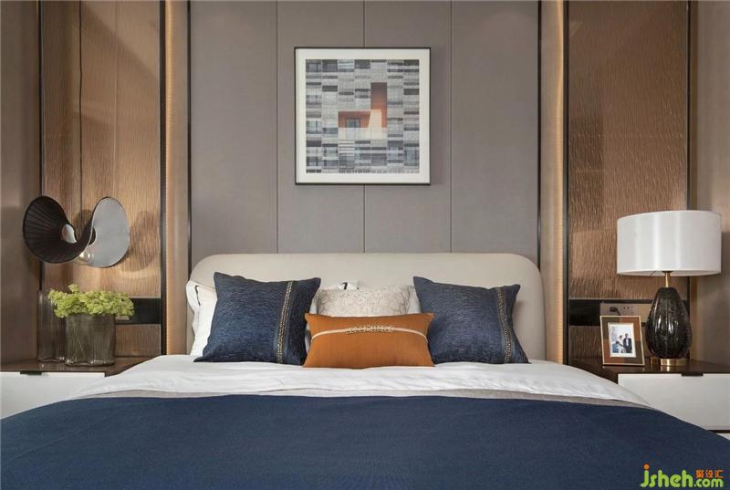 次臥的冷色床品與墻面、掛畫相搭配,乳白色柜體有了棕色的裝飾條,光源的暖色也不會顯得突兀。