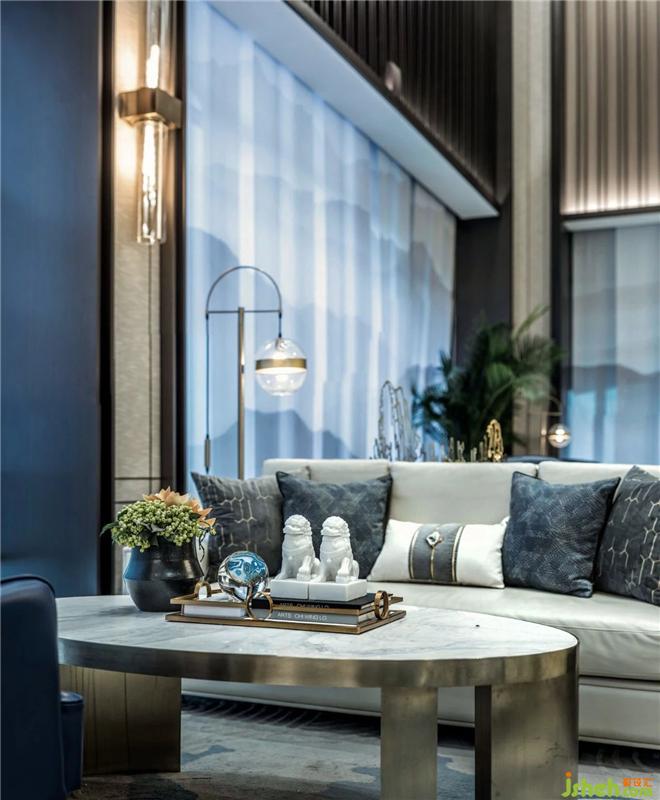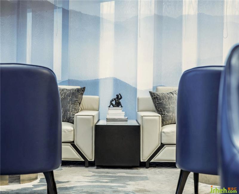 室內(nèi)空間延續(xù)了建筑外觀的藍色色調(diào)??臻g營造的素與靜,結(jié)合窗簾布藝描繪的山水寫意,透著朦朧感,將自我融合到自然物像之中,便能體會“天人合一”的美妙意境。