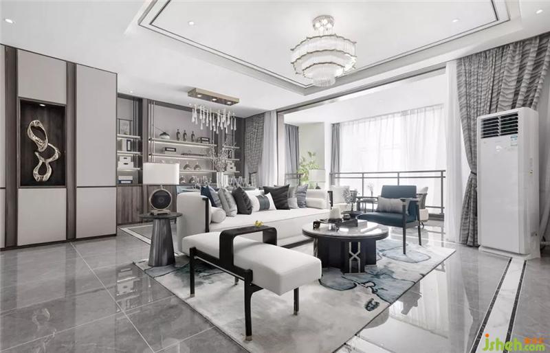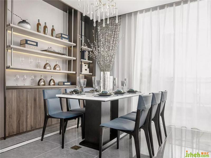 客廳空間以幽雅的灰藍(lán)色為主色調(diào),與茶幾大理石的自然紋路演繹了一幅山水畫,賦予了空間綿綿不盡的詩意想象,給人有莊嚴(yán)、尊貴、神秘的感覺。樣板房設(shè)計