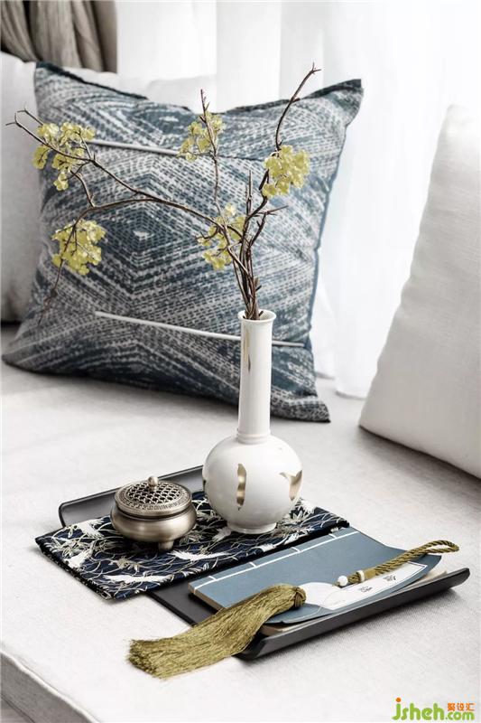 主臥的花枝背景墻與刺繡床品布藝搭配組合,訴說著主人細(xì)致儒雅的個性。樣板房設(shè)計