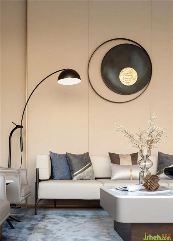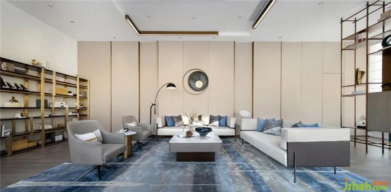 VIP室是針對重點客戶、意向客戶、簽約客戶進行深入交談的私密空間。針對不同功能需求,配置了不同的家具搭配,能滿足大家庭前來洽談的一組MINOTTI皮質沙發(fā)、單椅、方凳,搭配金屬與石材的茶幾進行材質的碰撞,點綴藍色與金色拼接的掛飾提升空間的雅奢感。裝修設計
