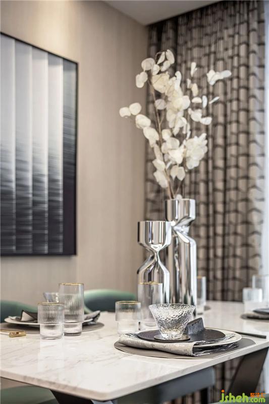 The living room serves as the center of spatial interaction, with large floor-to-ceiling windows and open balconies that allow light to be maximized. The rushing green laid the coolness of the space, and the metal elements were embellished on the details of furniture and lighting in different forms, making the space more clear and clear. The oasis sentiment pursued by contemporary urbanites is full of mood with the blooming colors and materials.