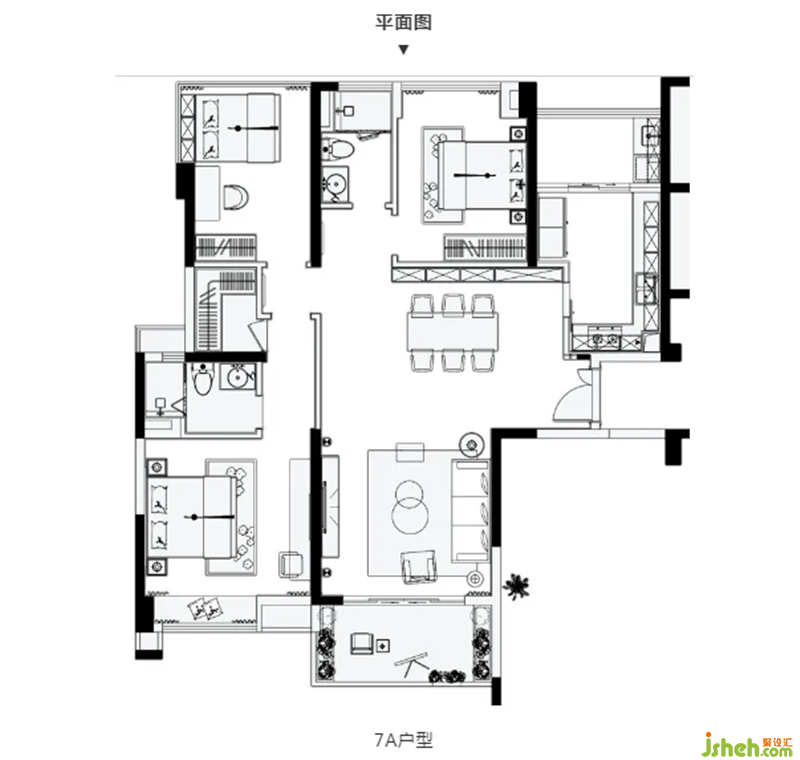 客餐廳呈開放式設(shè)計(jì),六人位的餐桌拉近了人的距離,同時(shí)也增大了通道的空間,使得整個(gè)客餐廳更顯大氣寬敞之感。劃分在室內(nèi)的陽(yáng)光充足,鄰近寬大開闊的玻璃外門,視野開闊,空間上給人以通透之感。