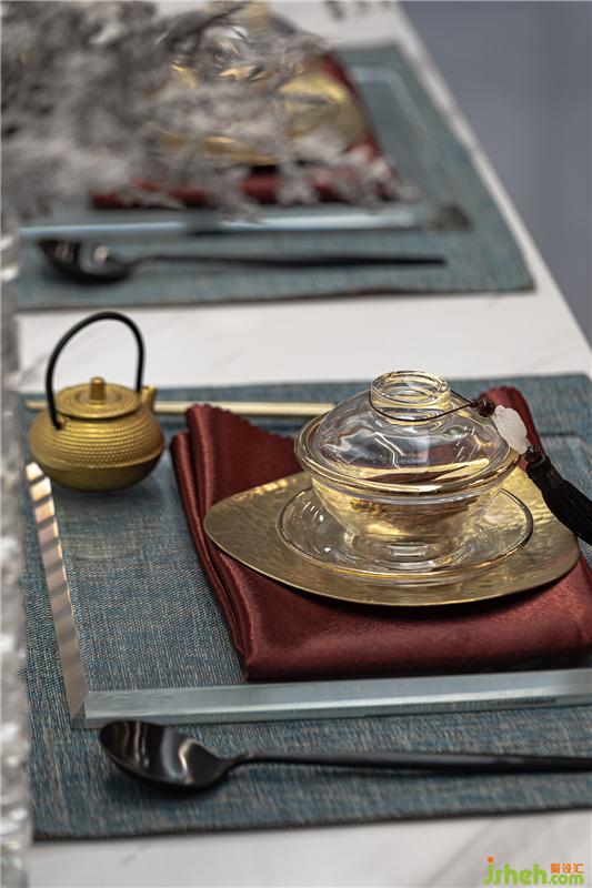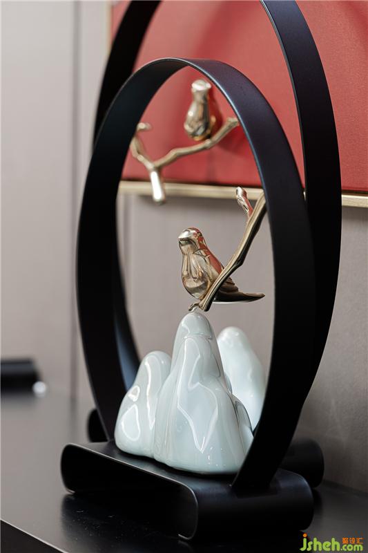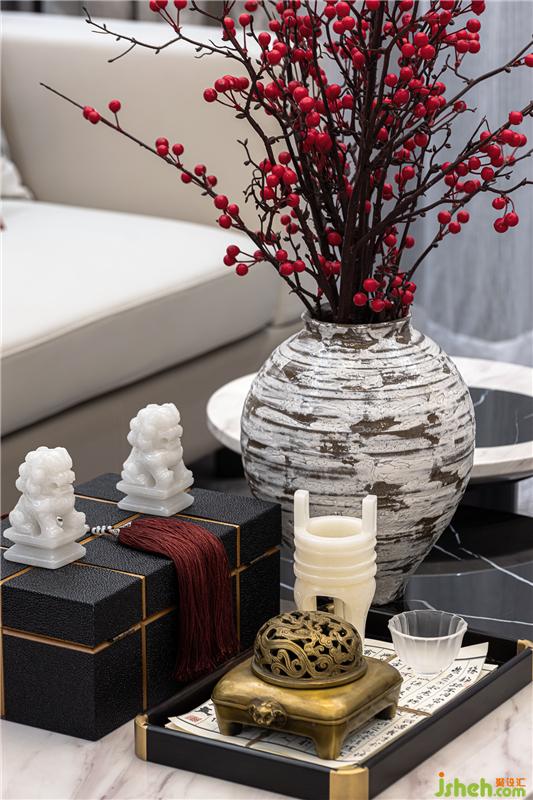 餐具、飾品結(jié)合整體風(fēng)格及空間氛圍,在自然光線與室內(nèi)燈光的點(diǎn)綴之下,更突顯品質(zhì)感,新中式格調(diào)的味道彌散在每一處細(xì)節(jié)。胡桃木與磚紅色搭配的端景臺(tái)點(diǎn)綴在入門盡頭,精美的畫作、氣韻生動(dòng)的倒流香擺件,整個(gè)空間更突顯悠韻綿長(zhǎng)之感。