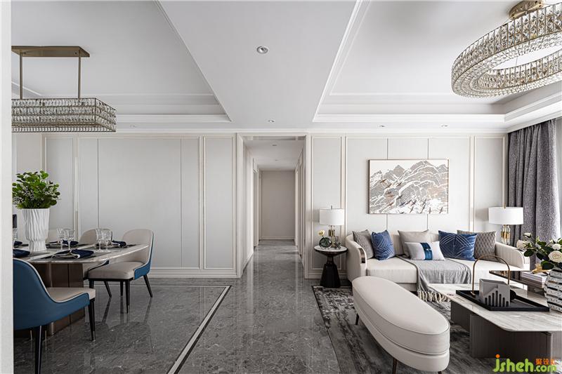 素雅的色調(diào)搭配“深灰藍”以典雅高貴的金色在空間中平衡出沉穩(wěn)而不失時尚的特質,體現(xiàn)新時代人群對生活品質的追求,感受雅奢簡歐氣質之風。硬裝以極致簡約風格為基礎,通過一些金屬和石材的元素來凸顯質感,同時也濃縮著意想不到的功能與細節(jié),從而彰顯了一種高品質的生活方式。