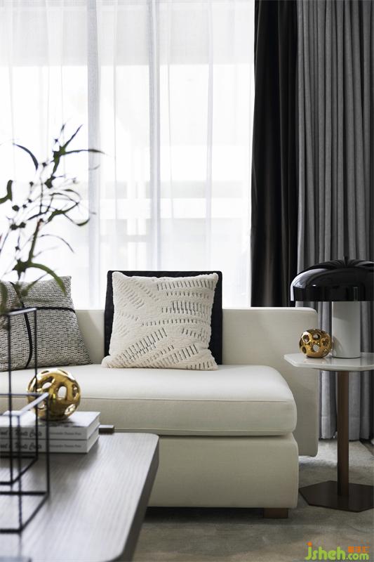 客廳通過開放的空間設(shè)計與舒適的材料,營造輕松、精致又不失格調(diào)的氛圍。黑白灰為基礎(chǔ)色,點綴了幾處“垂楊幾處綠煙濃”的“綠煙”色(綠煙是指初春的楊柳泛出的如煙一般的綠色),既保留了綠色的生機又給人以平靜的感覺,使空間獨具韻味。