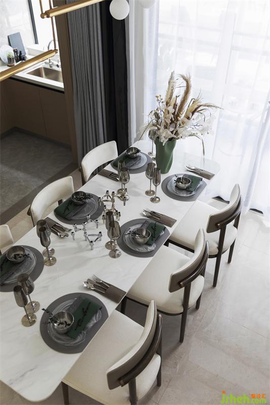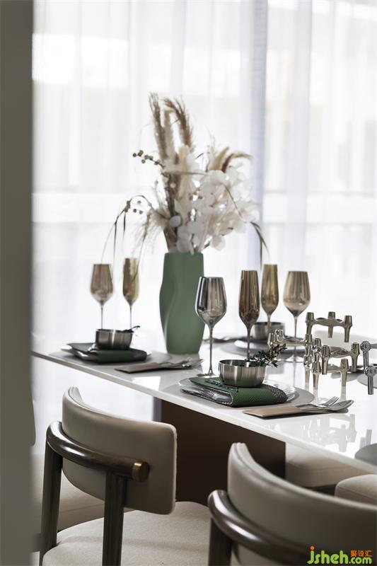 "唯有美食與愛不可辜負";餐廳延續(xù)了客廳的詩情綠意,精致的餐具錯落有致,四方餐桌與餐椅方正排列有序,有層次感的椅背搭配白色大理石臺面的餐桌,花瓶與餐布的綠,不多不少,整個用餐空間營造出自然健康舒適的氛圍。