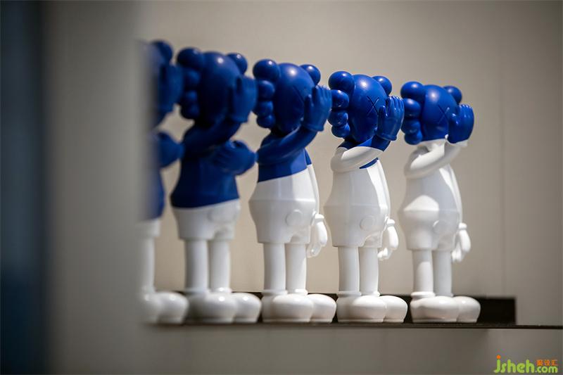空間整體以灰白皮革硬包加墻布打底,在干凈利索的底色上鋪陳克萊因藍,通過不同大小不同體態(tài)的KAWS玩偶的陳設(shè),讓整個空間充滿了動感。
