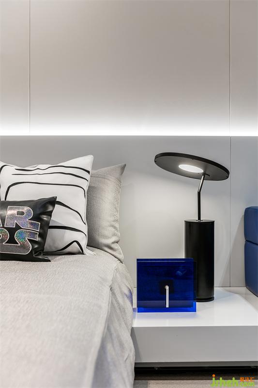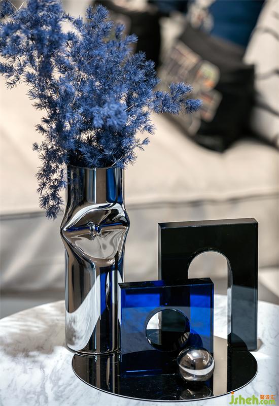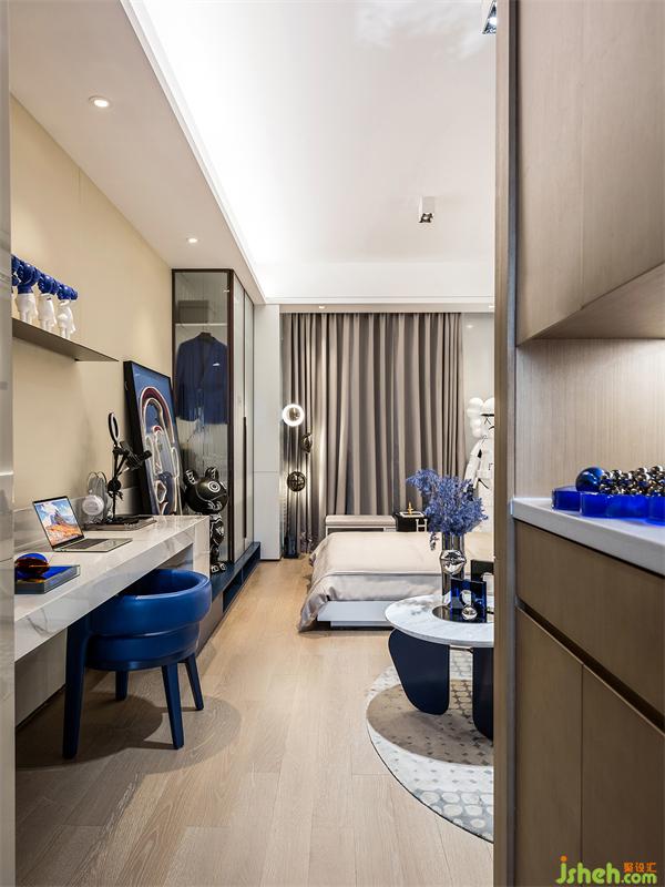 結(jié)合主人公的職業(yè)及愛好,我們將空間引入了極度純凈的克萊因藍??巳R因藍是一種獨特的天青石藍色,兼具群青色的深沉內(nèi)涵,和藍寶色的高貴光澤,能喚起人們最強烈的心靈感受。整個空間兼具時尚潮流和生活溫度的同時,又非常注重居室空間的布局與使用功能的完美結(jié)合。