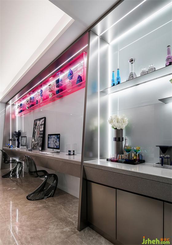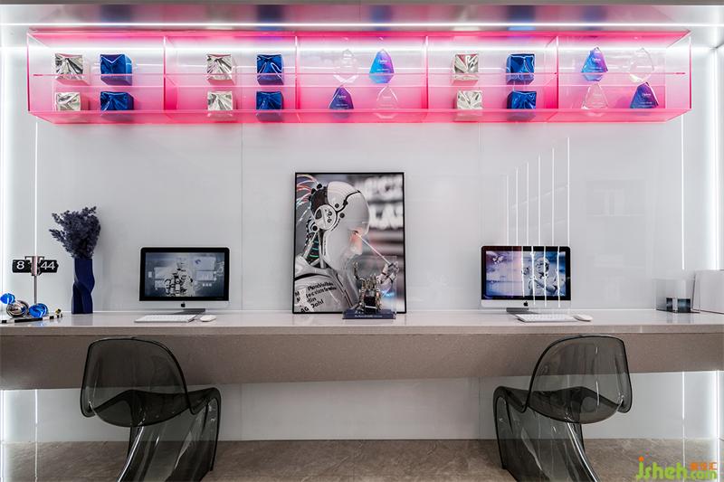 辦公區(qū)配以造型別致的桌椅,打破了空間的單調(diào),展示區(qū)墻面機(jī)器手臂掛飾以及大屏電腦配置為來訪者提供互動(dòng)體驗(yàn),感受科技的神秘力量,以此致敬科技的發(fā)展,表達(dá)對科技探索的渴望,引領(lǐng)著人們在舊范式與新空間,未來與現(xiàn)實(shí),虛與實(shí),動(dòng)與靜中來回穿梭,營造一個(gè)年輕,時(shí)尚,個(gè)性又充滿科技感的辦公空間。