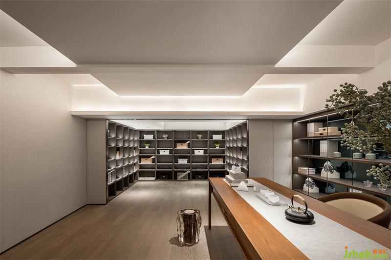 陳羽曾在《茶經(jīng)》里說(shuō)到喝茶的客數(shù),最適宜數(shù)三數(shù)五,他講“茶性儉,不宜廣,廣則其味淡?!?。茶室的淺色調(diào),配淺木色木地板及木格柵,軟裝則以重色家具和較低的茶臺(tái)調(diào)和空間沉穩(wěn)的調(diào)性。