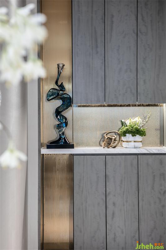 在方正的客廳空間,我們用借景的手法打破對稱,銅川樣板房設(shè)計在胡桃木飾面打底的背景墻上懸掛著一幅時光的印記——用水晶馬賽克演繹的檐角片訴說這座城市的過去,又播放著家的未來。邊幾上屹立的吊鐘將家人的優(yōu)雅姿態(tài)詮釋的栩栩如生。回到家洗去外面世界的嘈雜,與家人閑坐,輕松自如,沒有了拘謹和束縛,釋放身心。我把玩新買的小雕塑,你凝望上次生日收的釋迦果。微風襲來,茶幾上的山茶花撒播著沁人心脾的香味,是甜蜜生活最真切的注腳。