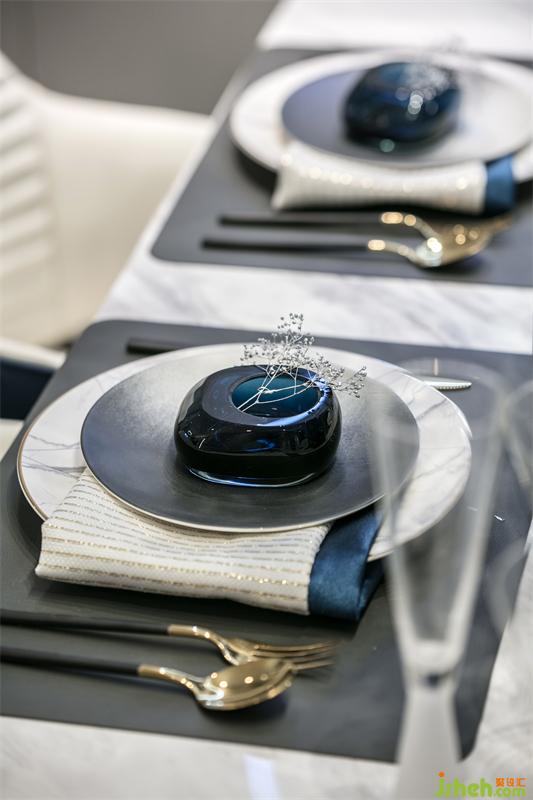 東方文化的骨髓里都在強調(diào)對稱和儀式感,整齊劃一的餐具,對稱排列的餐椅,星星陣列的吊燈,在碧城色圓月型壁燈的照耀下,有種圓滿又回歸的悸動。女主人精心準備的姜花顯得格外的典雅和悠揚,畫面再現(xiàn)“漫空沙氣蜀姜黃,一角高城漏日光”的場景。