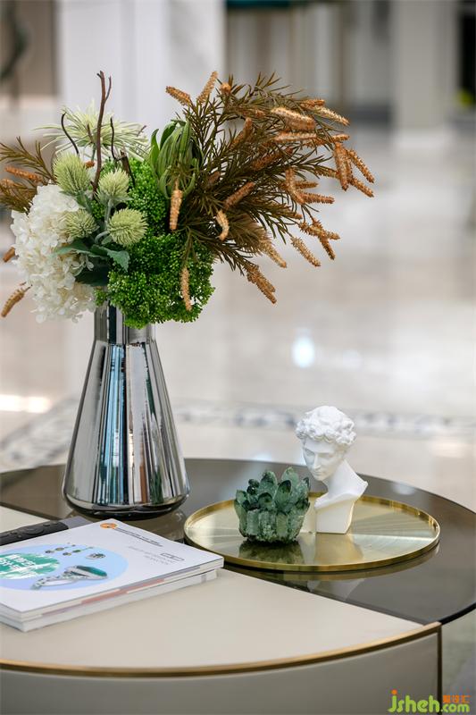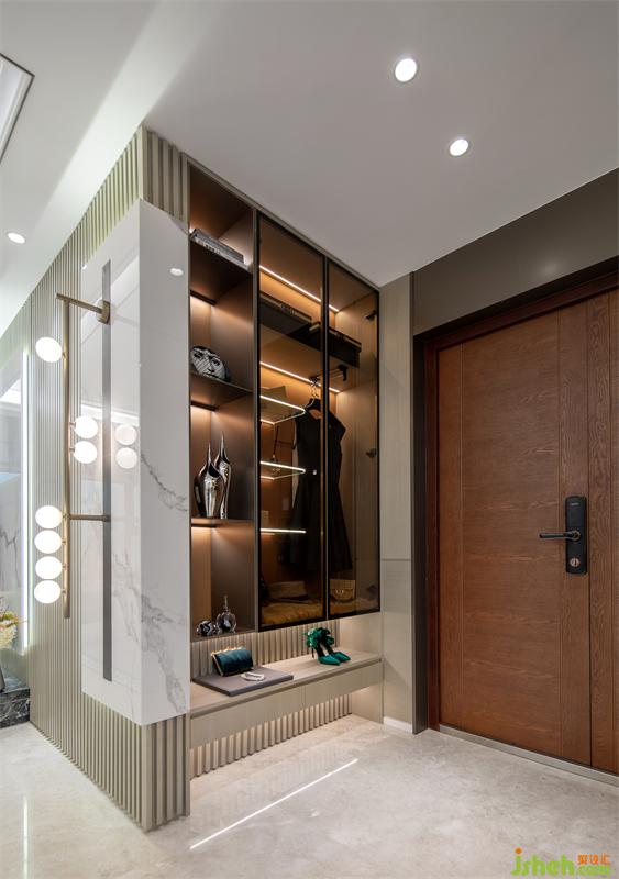 樣板間設(shè)計運(yùn)用黑白灰為主色調(diào),金色、綠色作為點綴色。玄關(guān)是進(jìn)入整個空間中的第一印象,也是主人職業(yè)特性的體現(xiàn),精致的服裝及珠寶,是受益于女主人的職業(yè)特征,精心為家而打造的,女主人是一個愛裝飾家的人,同時也給空間氛圍增加了儀式感和歸宿感。