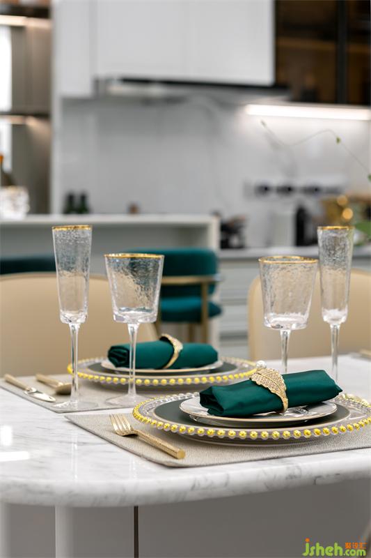 樣板間設(shè)計客餐廳相連,餐廳的空間較為狹小,所以我們選用了較為簡單且有品質(zhì)感的餐桌與餐椅。每一個陽光明媚的下午,與家人享用著中西餐的美妙幸福時刻,新鮮美味的香氣環(huán)繞著餐廳和廚房空間,這就是家的味道。
