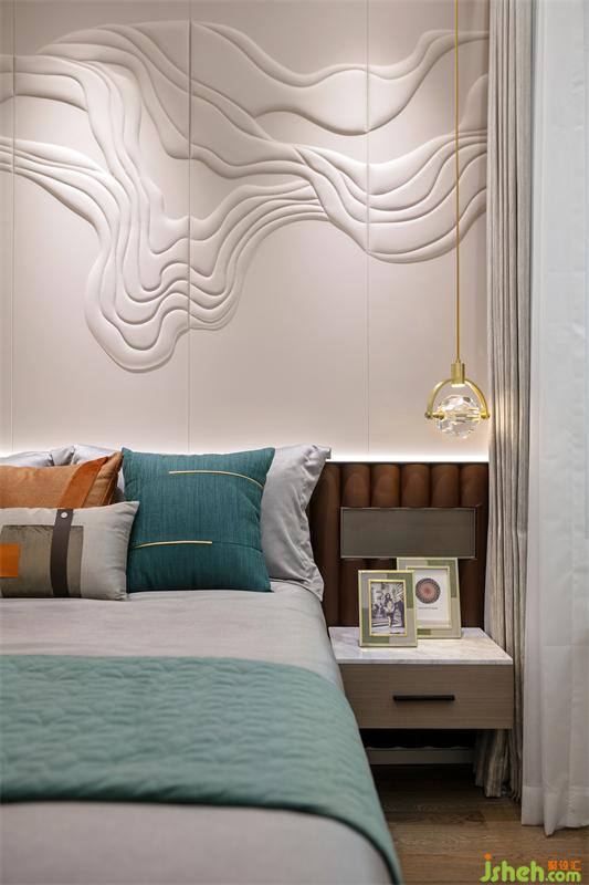 臥室是高雅的藝術(shù)場,承載著空間的情緒性表達(dá)。樣板間設(shè)計高品質(zhì)且具有設(shè)計感的床和床頭柜,邊柜墻面放置較為抽象藝術(shù)感的掛飾,以一扇窗打通室內(nèi)外的聯(lián)動。