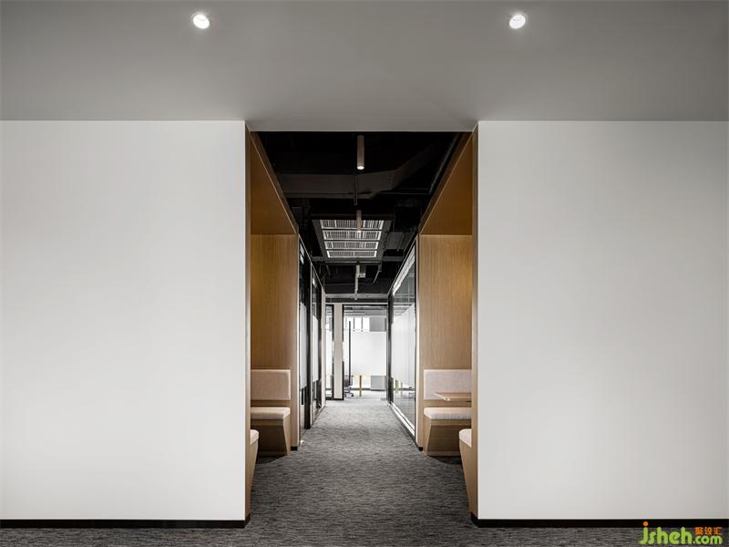 開敞辦公區(qū)統(tǒng)一采用玻璃隔斷,使辦公空間更加通透明亮,玻璃墻體窗口使不同區(qū)域的工作者保持自身空間舒適度的同時,也保持視線上的情感和需求連接。