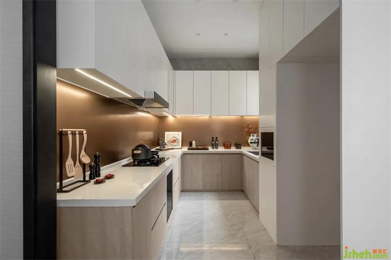 樣板間設(shè)計(jì)以美學(xué)和藝術(shù)品位來詮釋廚房概念,厚重的材質(zhì),凸顯質(zhì)感,空氣中彌漫著高級的煙火氣息。黑白色調(diào)的搭配,中和了橘與紅之間的距離感,讓整個空間更為協(xié)調(diào)。
