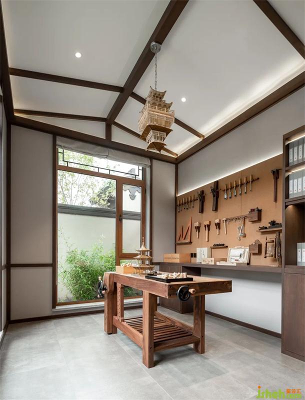 木工工作間展示了明朝時期成熟的木工和榫卯技術(shù)。樣板間設(shè)計(jì)以古舊復(fù)原的方式來進(jìn)行呈現(xiàn),在桌面區(qū)域設(shè)置了互動的榫卯?dāng)[件,可供參觀人學(xué)習(xí)互動體驗(yàn)。