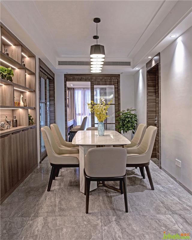 前提滿足生活陽臺的功能性同時(shí),而選擇擴(kuò)大客廳空間,重點(diǎn)營造整個(gè)公共空間視覺感??蛷d電視背景隱形門設(shè)計(jì)起到虛實(shí)的不斷變化,也滿足業(yè)主心理需求——見和不見??蛷d以爵士白大理石和原木飾面建立一個(gè)質(zhì)樸安寧的素雅居住氛圍,達(dá)到一種更接近與內(nèi)心自我、更接近天然的狀態(tài)。自然采光略少的餐廳,采用了更為利落、輕盈的手法,與客廳形成明顯的空間跳躍感。體量不小的邊柜,將一切餐用有序地歸納、整潔。
