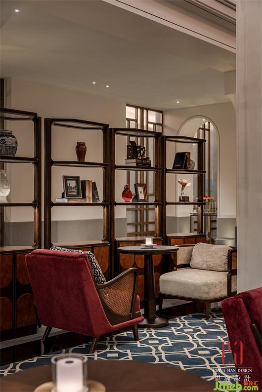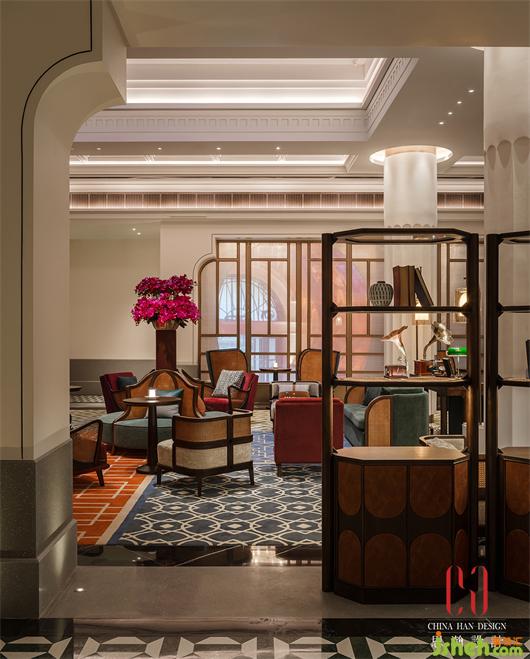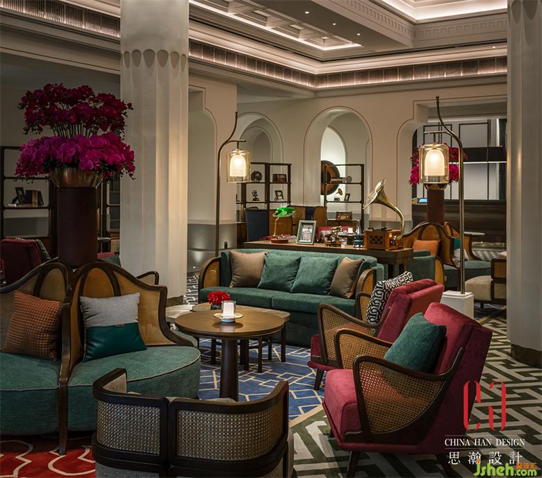 自由圍合的沙發(fā)和藤椅,國際酒店設(shè)計配合明度和飽和度偏低的紅色、綠色靠墊以及各種窗楞格紋的地毯,搭配充滿宮燈、老照片、將軍罐、唱片機等充滿城市記憶的物件,民國風(fēng)情撲面而來。