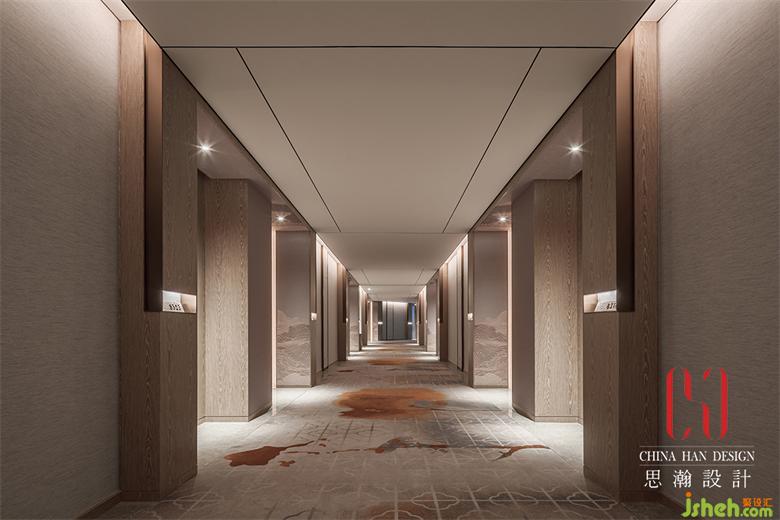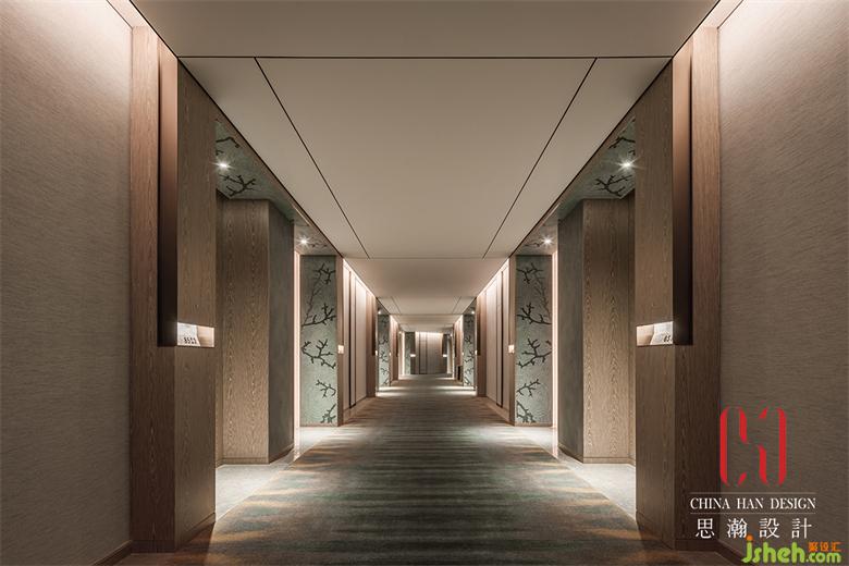 光線通透的電梯廳依然延續(xù)著金屬飾面與米白色墻面的組合,大氣而優(yōu)雅。端景處竹節(jié)造型的瓷片像素畫渲染出西海山水的群山風貌。
