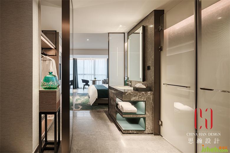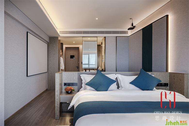 武寧酒店設(shè)計挑空的大堂豁然開朗,端景的遠山,水紋的藍毯,木幾上的迎客松、玻璃柱上的繁花構(gòu)建出一派建筑與山水的天然共融。這里既有南方水鄉(xiāng)溫婉唯美的意境,也有親近山水的純真質(zhì)樸家園。