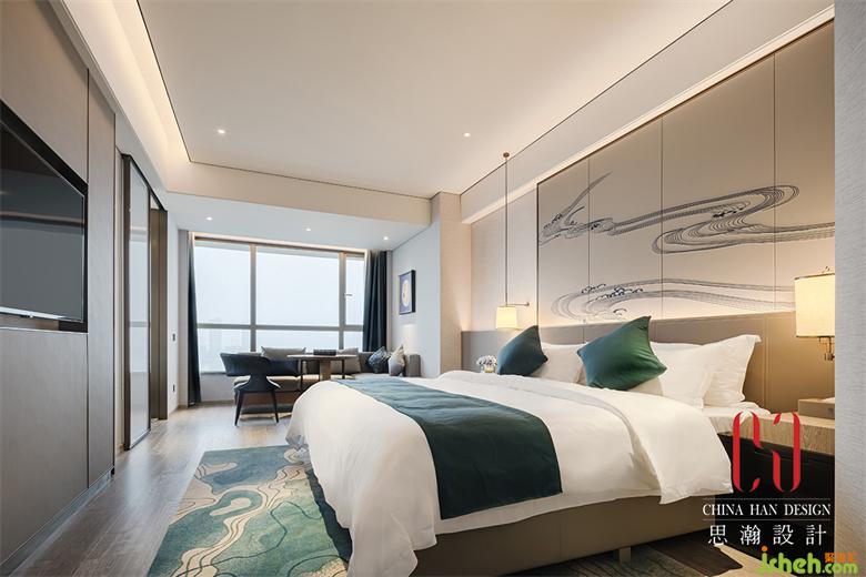 4-5層定位為輕奢雅致,西海中點綴的群山風貌成為了這里主題,青綠色的不規(guī)則紋路,仿佛伸進湖水中的山脊和水岸線。