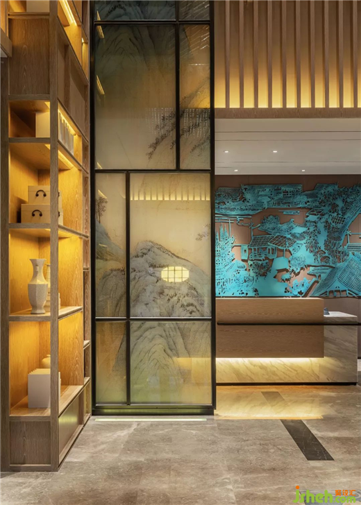 酒店大堂延續(xù)外立面的建筑元素,酒店設(shè)計將四合院的屋頂形態(tài)藝術(shù)化的表達,運用現(xiàn)代的琉璃材質(zhì),塑造現(xiàn)代的時尚與輕奢感。墻面自然元素的屏風與木格柵,營造現(xiàn)代簡潔的和諧之美。