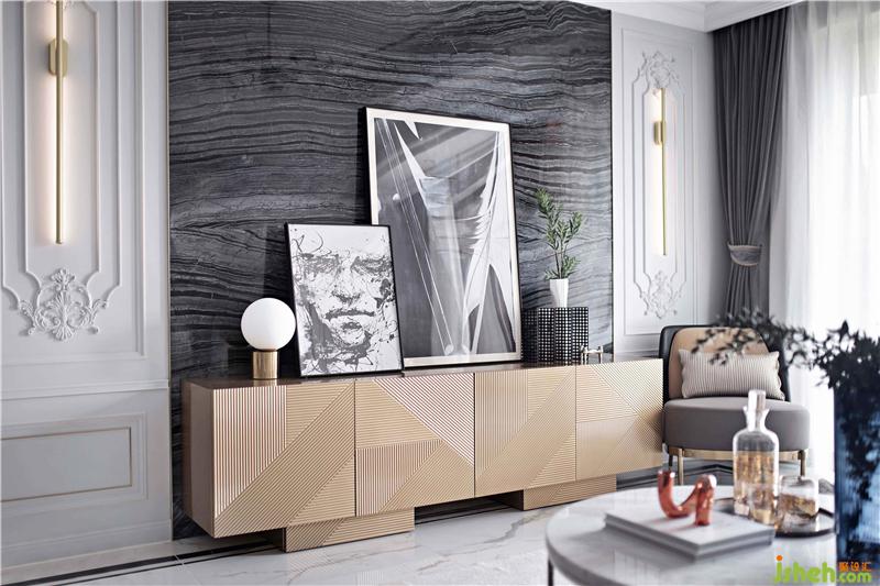 黑色在很多人的印象中是沉悶壓抑的,但是在室內(nèi)設(shè)計(jì)師筆下,這種擔(dān)憂是不存在的。原木色電視柜,精美絕倫的雕刻幾何切面,與古木紋大理石背景墻形成極大的反差感,而使得空間層次更加分明!