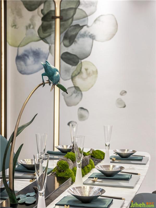 將山水、鳥雀和光影結(jié)于一庭,自然肌理的山巒小景、水彩藝術(shù)屏風(fēng)、香蒲藝術(shù)裝置等,經(jīng)典的符號(hào)、現(xiàn)代的工藝,與生活場(chǎng)景交疊融合,寥寥數(shù)筆,極具東方氣息的禪意空間躍然而出。