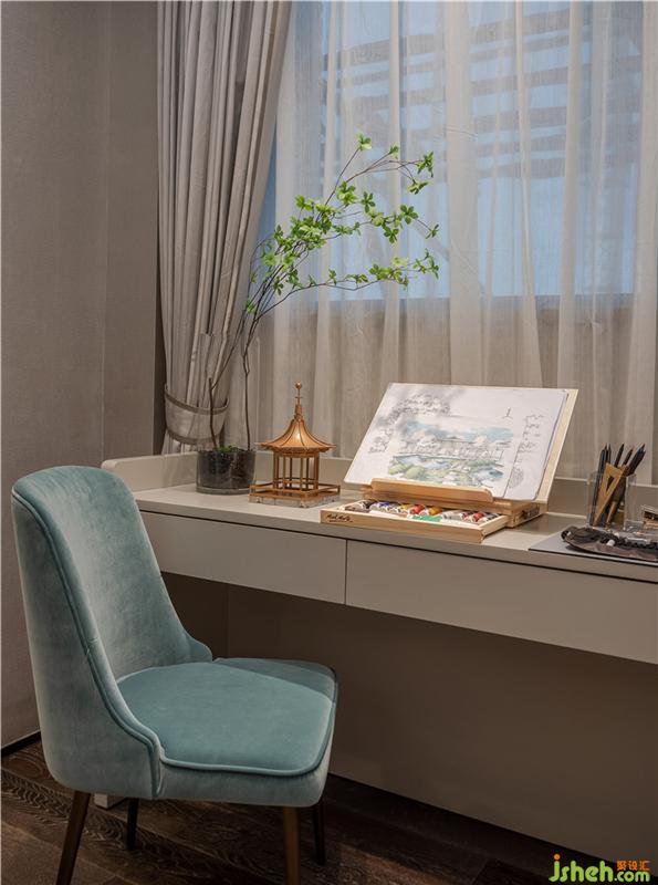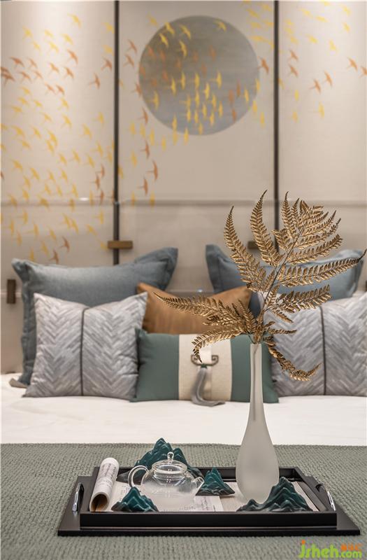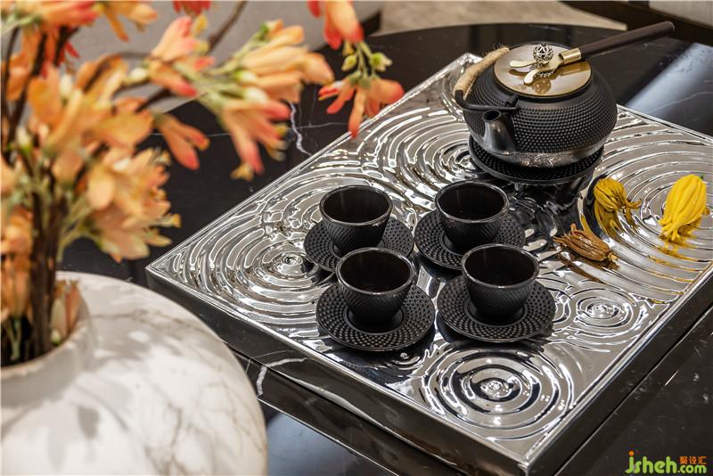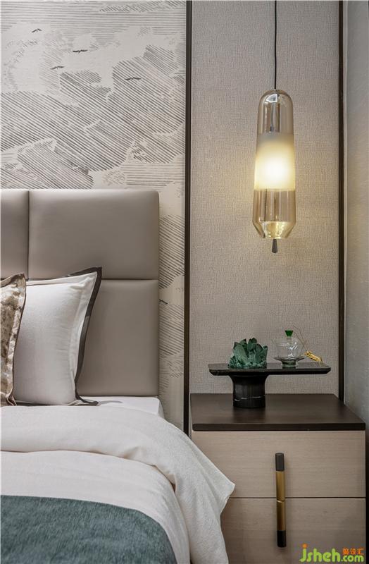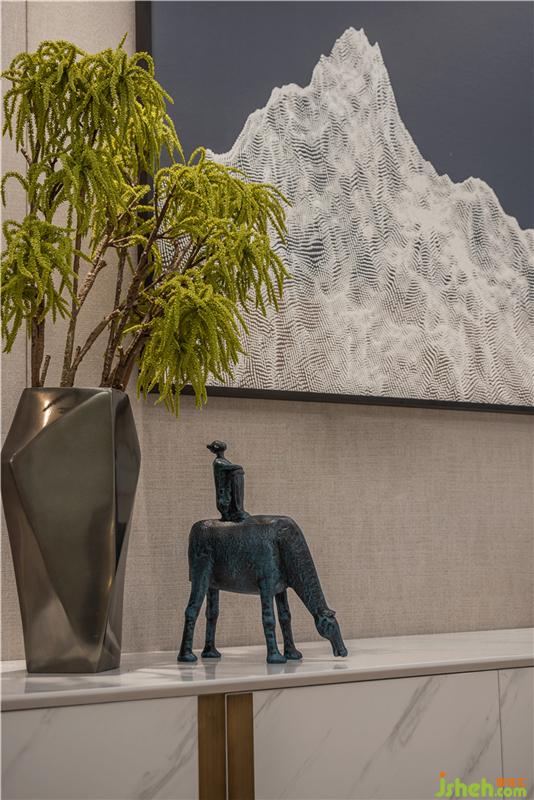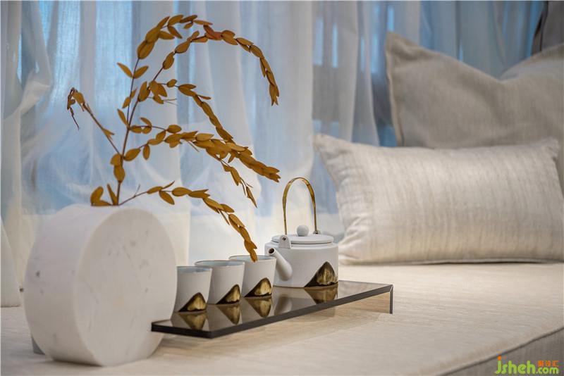 禪意東方的設(shè)計不一定需要東方的表達形式,設(shè)計師摒棄了傳統(tǒng)東方元素,而是在配飾、擺件上做功課,反而更能讓居者感受到空間所要表達的情緒。山石、水紋、綠枝、茶杯,構(gòu)造出“水光瀲艷山色空蒙”的美景,陽光透過紗簾灑落進來,空間也納入更多晨光與清風(fēng)。