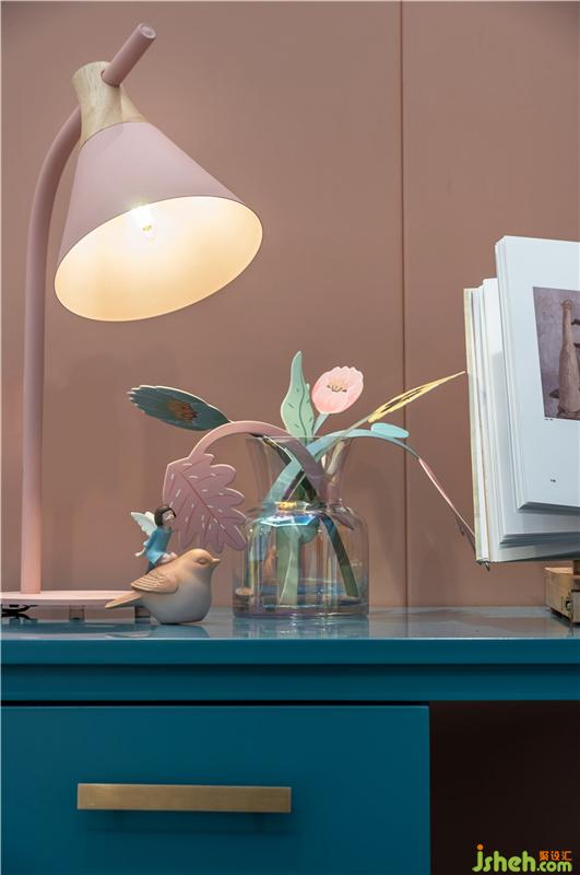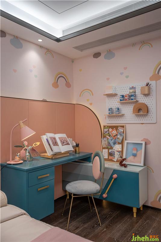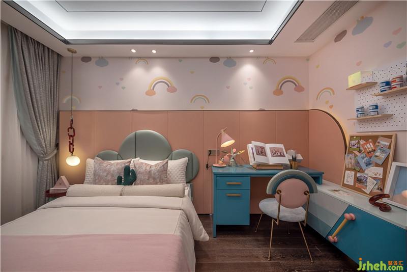 女孩房以馬卡龍粉與水藍色交織,彩虹地毯的點綴,各種花卉的裝飾擺件,通過空間里各個家居之間的搭配及穿插,呈現(xiàn)具有當(dāng)代感的孩童藝術(shù)性空間,隨各個色塊與線條的變化,豐富視覺層次。