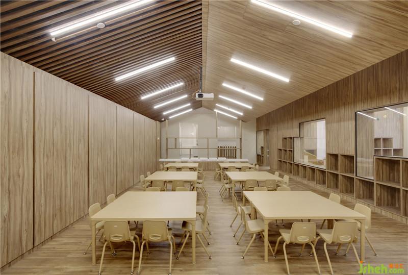 將一半的天花設(shè)計(jì)為木質(zhì)柵格狀以配合空調(diào)通風(fēng)系統(tǒng)??紤]到孩子們的視力健康,設(shè)計(jì)師選用了柔和不刺眼的內(nèi)嵌式燈管來(lái)照亮整間教室。