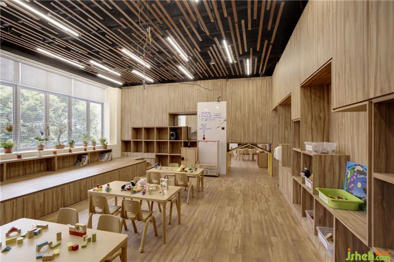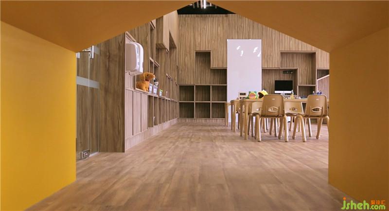 首先,設(shè)計(jì)師使用了簡(jiǎn)單干凈的木色來(lái)作為整個(gè)設(shè)計(jì)的主要顏色,并用木質(zhì)材料取代瓷磚和涂料。孩子們可以赤腳奔跑在木質(zhì)的地板上,在無(wú)形之中向孩子們傳達(dá)低碳,綠色環(huán)保的教育理念。室內(nèi)設(shè)計(jì)師