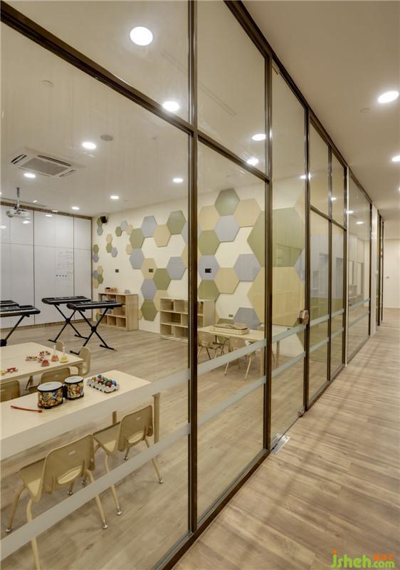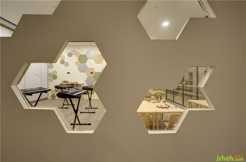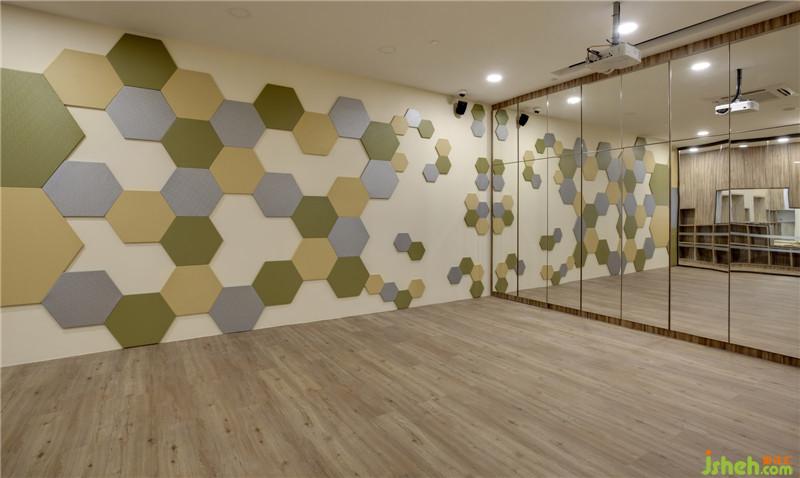 在音樂教室的墻面設(shè)計了三種不同由六邊形由三種顏色的六邊形組成,有青春朝氣的綠色,積極向上的黃色和象征平緩安靜的灰色。運用這三種色彩的淡色系,給孩子們帶來舒緩,放松的效果。室內(nèi)設(shè)計師