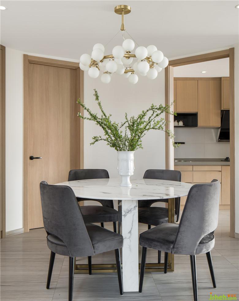 本案在入戶長(zhǎng)廊做了大膽的改動(dòng),室內(nèi)設(shè)計(jì)師將原本的長(zhǎng)廊改成圓形的餐廳,餐廳的四周用柜子砌成圓形,這樣的改動(dòng)首先打破了入戶長(zhǎng)形走廊帶來(lái)的壓抑感,其次滿足了業(yè)主對(duì)圓形餐桌的需求。
