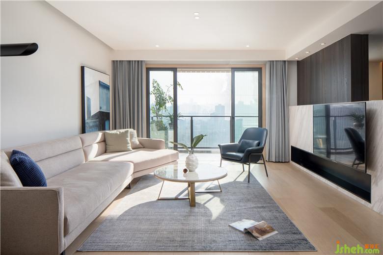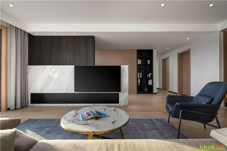客廳的電視墻做了高低錯(cuò)落的設(shè)計(jì)在立面構(gòu)圖上美觀大方,大理石和木飾面材質(zhì)的綜合運(yùn)用給視覺(jué)帶來(lái)了巨大的沖擊力。電視柜的背面是親子空間,坐在大理石電視柜背面的吧臺(tái)上即可以照顧孩子也可以跟客廳的人有所的交流,室內(nèi)設(shè)計(jì)師這樣的設(shè)計(jì)給業(yè)主的生活帶來(lái)了極大的便利性。