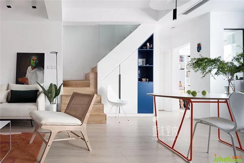 樓梯位于客廳與餐廳之間,通過樓梯可以到達(dá)二樓主臥室空間,樓梯下方的餐邊柜用了一抹低調(diào)的克萊因藍(lán)作為點(diǎn)綴,與地面、家具的大地色(暖色)系相互補(bǔ)。