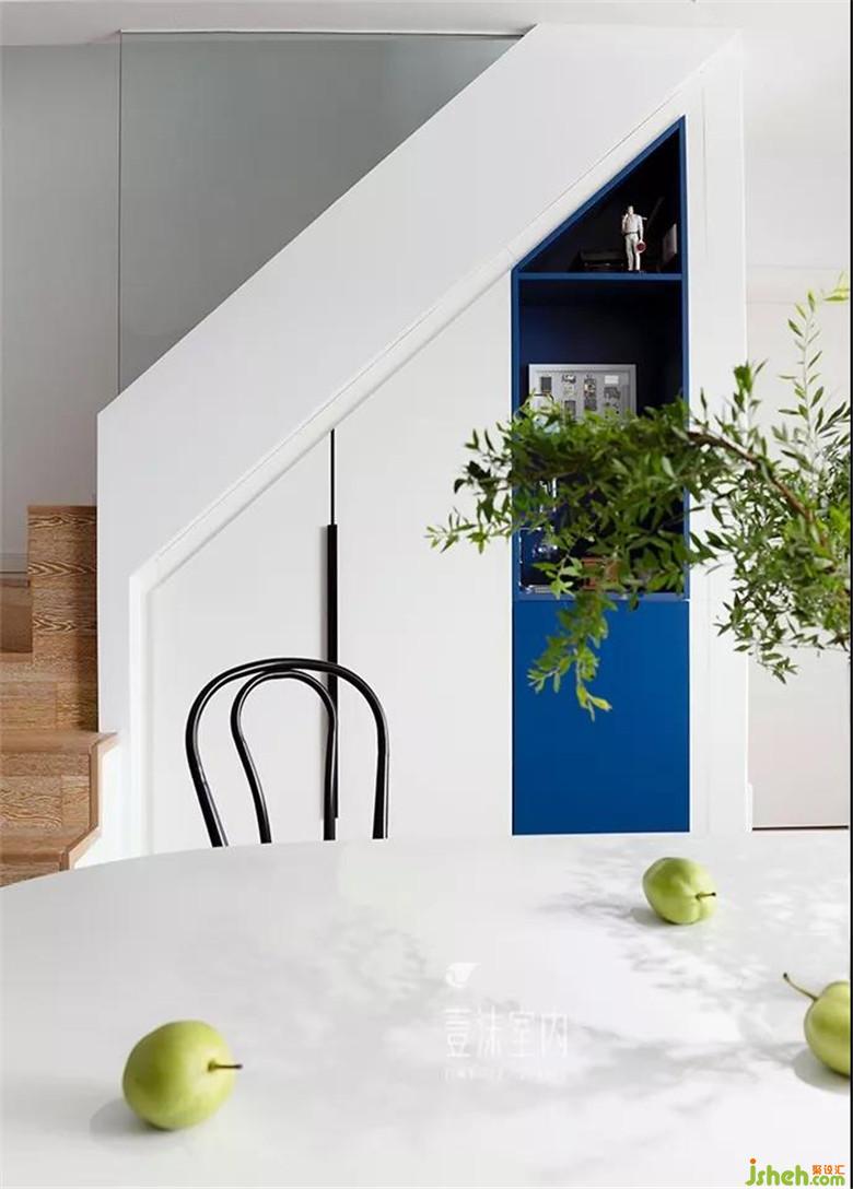 餐廳搭配不同的形狀質(zhì)感的座椅營造一種隨性慵懶的感覺,桔紅色桌腿與藍(lán)色柜面的冷暖對比給人一種強烈的視覺沖擊。