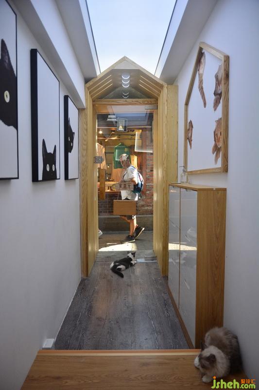調(diào)整了原始陡峭的踏步,增加臺階,保證鏟屎官們體驗(yàn)的安全性。在入口區(qū)設(shè)置免洗洗手液及拖鞋,保證鏟屎官們在進(jìn)入擼貓館之前病菌被消滅。同時設(shè)置墻壁上的畫作作為游客自拍點(diǎn)。