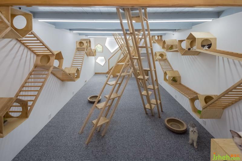 屋形的貓窩通過開洞和貓爬架相互串聯(lián),在墻面上形成一整片活動區(qū),使得貓咪們可以自由玩耍探索。貓爬架形成的特殊光影,也為貓咪們提供了新的趣味。