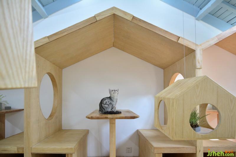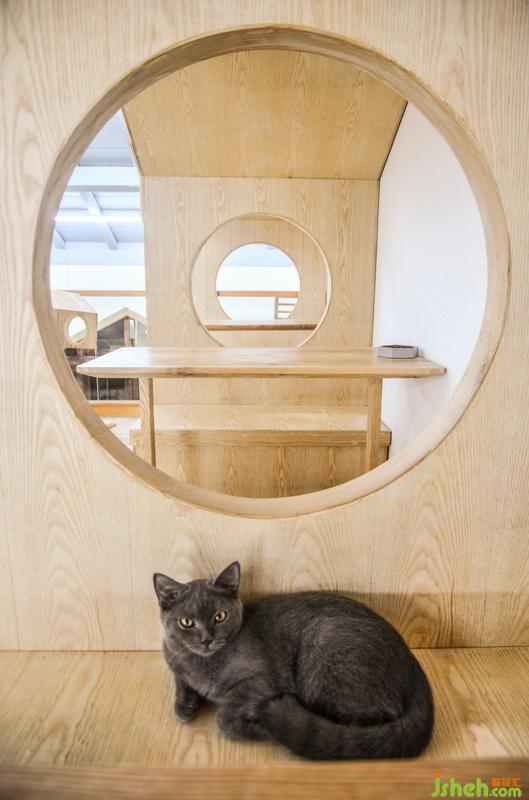 室內(nèi)設(shè)計(jì)師在三層休息區(qū)設(shè)置屋形固定座位,供客人們更加舒適的擼貓。同時在座位之間設(shè)置圓形洞口,保證主子們的來去自如。