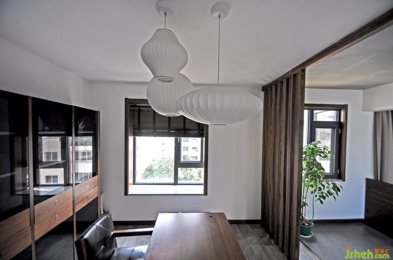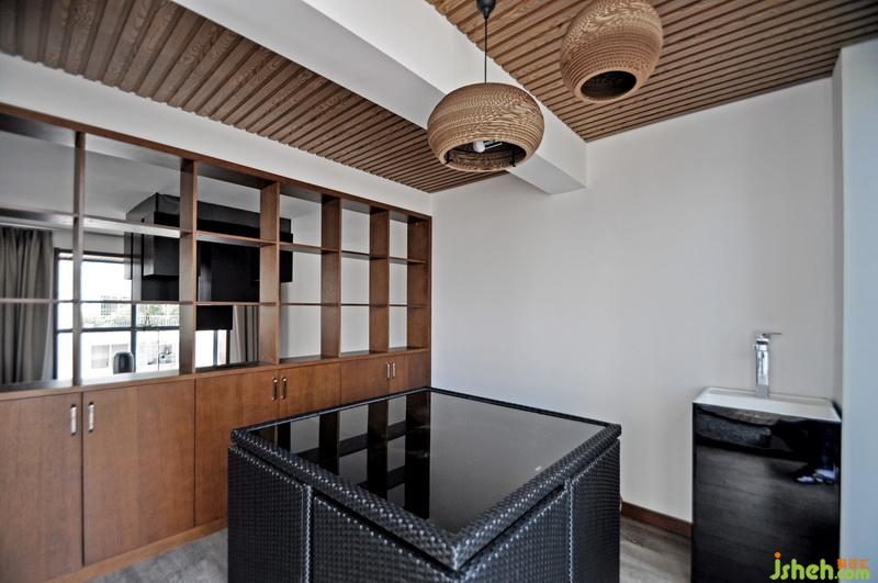 書房被提高一個踏步的高度并被展柜和客廳相隔,采用了半開放的狀態(tài),呈現(xiàn)一種半公共空間的感受。茶室用了一個可用于室外的可收納式的茶桌,方便隨時搬到露臺使用。